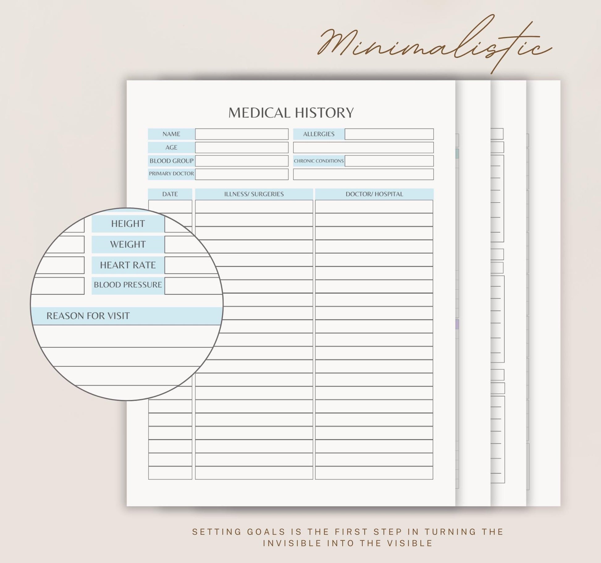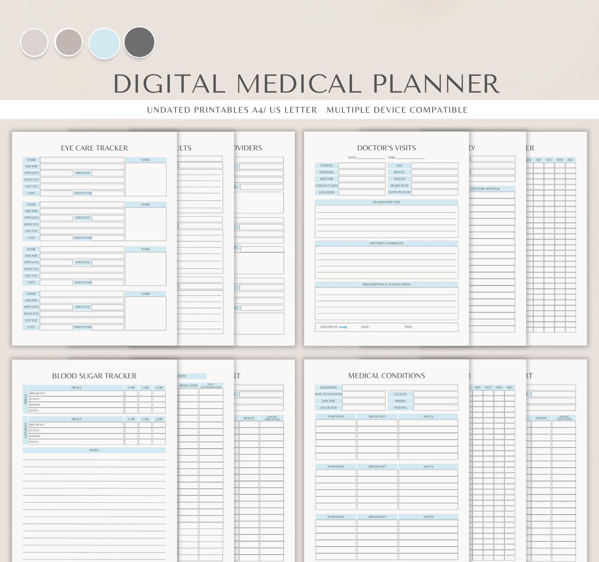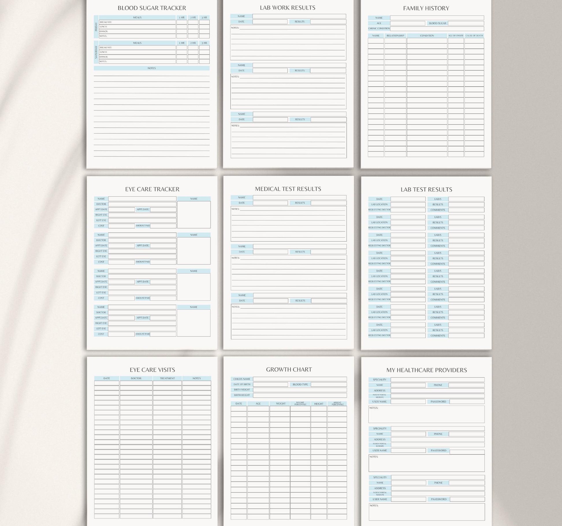 ✔ Doctor visit and medical history record sheets